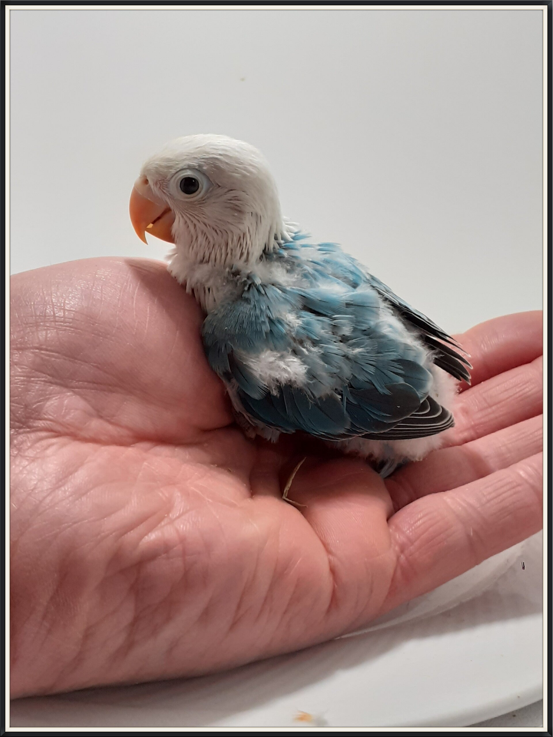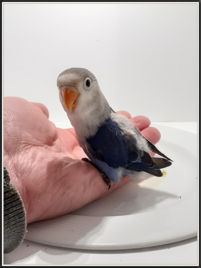 Tous ces oisillons sont issus de mon élevage ! J'ai choisi de photographier à cette période car l'oiseau ne vole pas encore, et reste donc +- stable sur le plateau ou la main pour faire une photo correcte. Après la photo, ils retournent dans les nids jusqu'au sevrage. C'est les parents qui jugeront quand l'oisillon sera prêt à les quitter pour la grande volière, et s' épanouir en tant qu' oiseau indépendant.