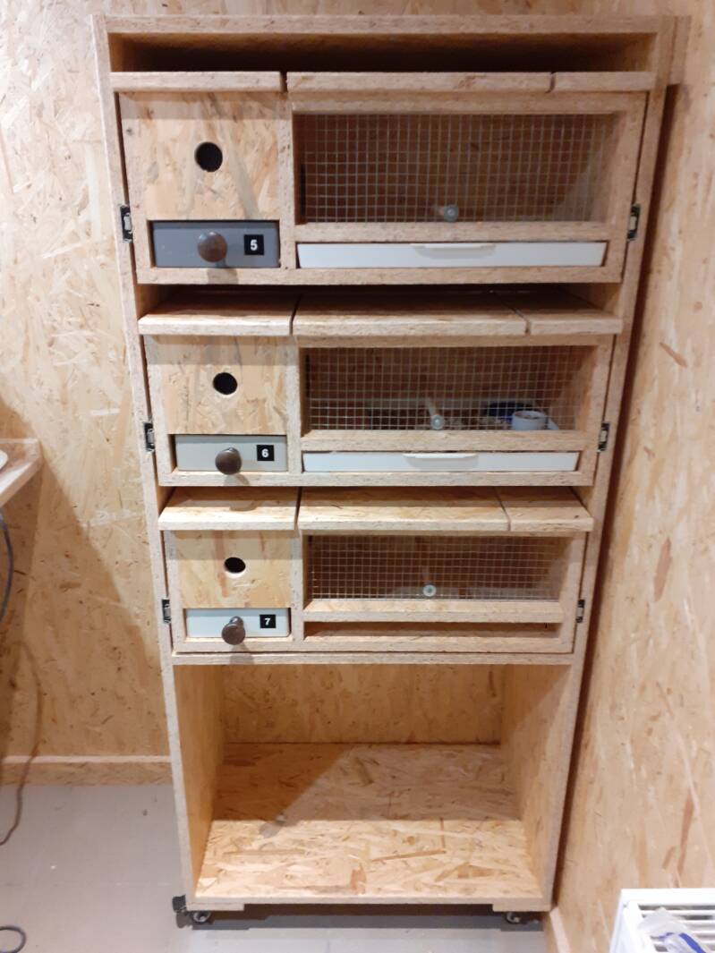 Un meuble composé de 3 tiroirs pour isoler les oisillons en traitement