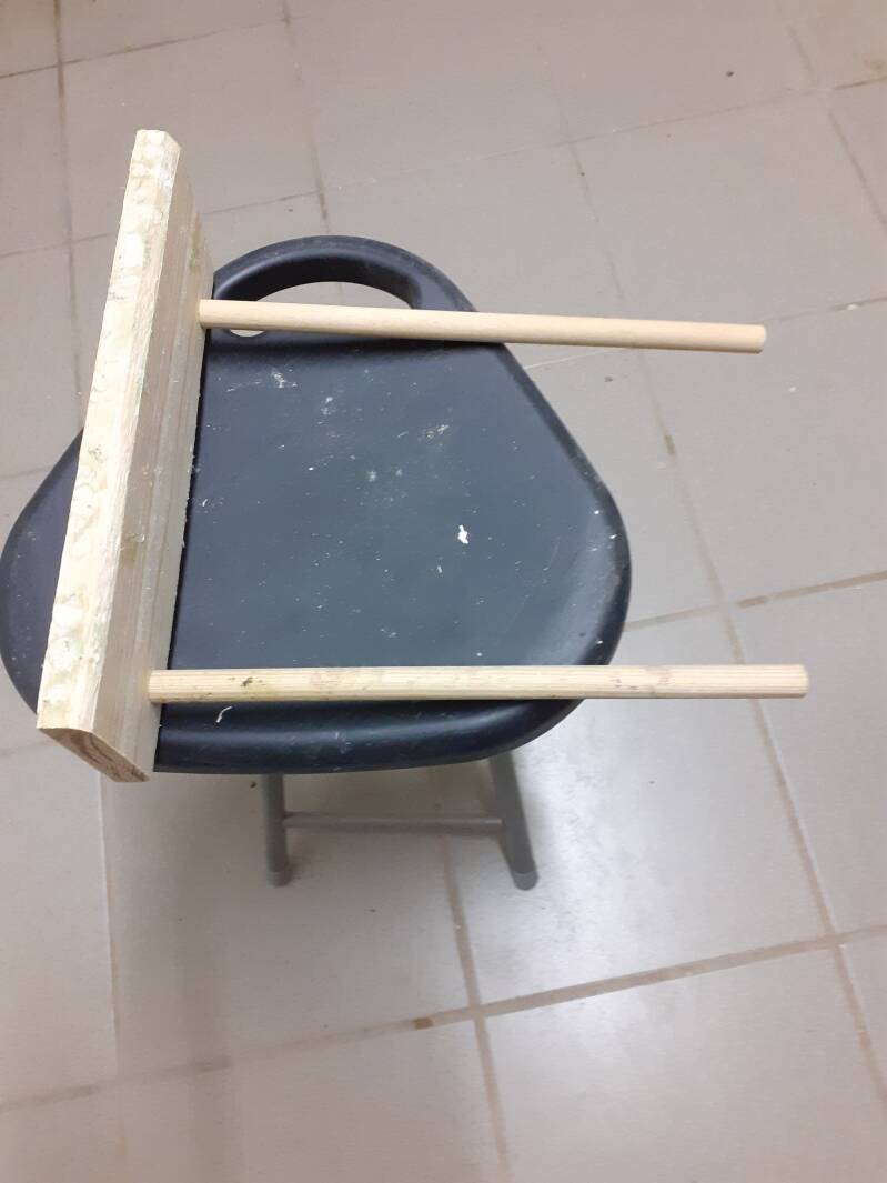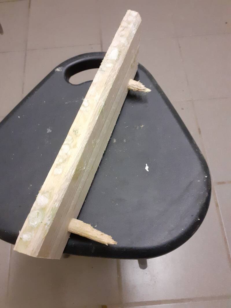 Il n'est plus à préciser que le bec des nos chers inséparables poussent sans arrêt... S'ils sont en mesure de gérer cette croissance naturellement, encore faut-il qu'ils aient à disposition, de quoi l'user. Il existe dans le commerce, de blocs à "ronger", mais il est très facile de faire ce que j'appelle des perchoirs à grignoter ... Ce petit montage est fait d'un morceau de planche de pin ( Attention: impérativement du bois non traité ) sur lequel je visse deux morceaux de bois rond de 12mm, achetés en grandes longueurs (2,70m) dans les magasins de bricolage... Il suffit de mettre 2 petits crochets en "L" au dos, et le tour est joué ... Les perchoirs se grignotent en quelques jours, mais il est aisé de les remplacer ... Voilà un jouet agréable et utile, à moindre coût ...