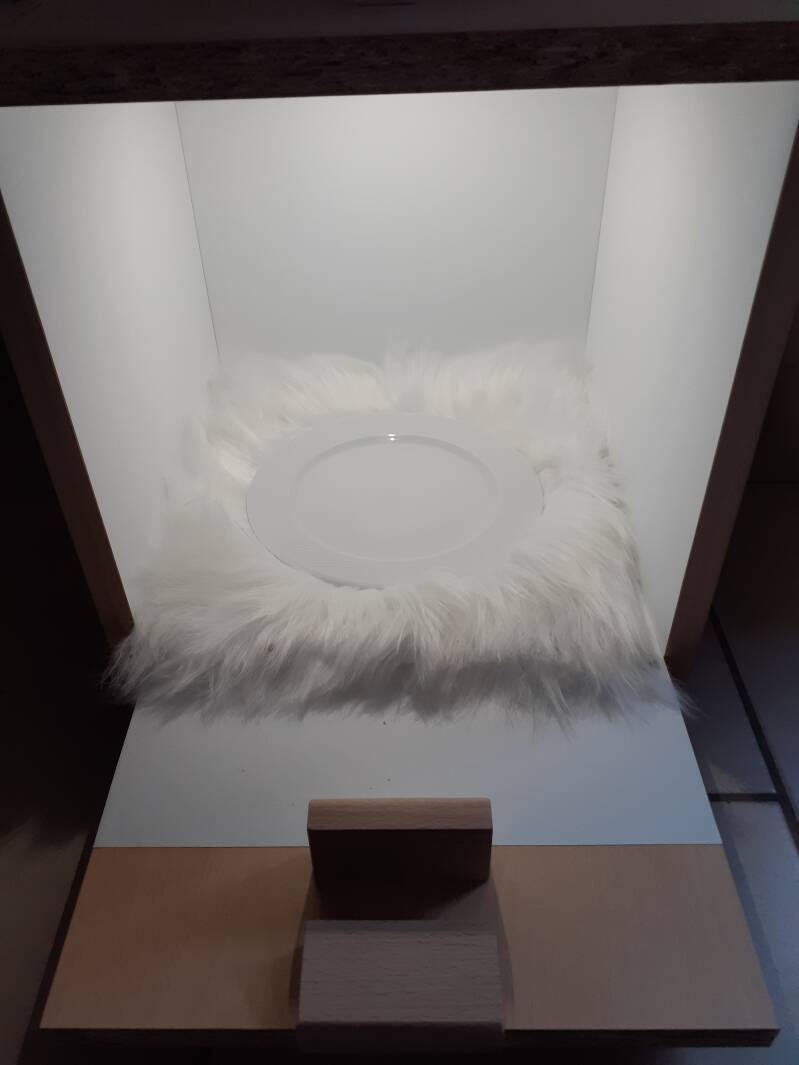Le principe est simple, il suffit de jouer avec la saturation de la lumière pour obtenir un fond blanc, avec l'ombre qui reflète sur une simple assiette de cuisine ...