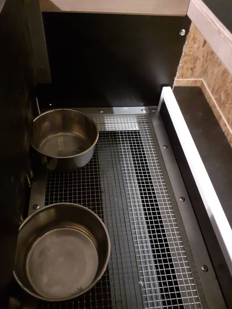 Le principe ? Pouvoir alimenter en graines aisément, et empêcher les graines de tomber au sol. Un grillage fixé sur un cadre amovible avec perchoir, et un tiroir avec bac récupérateur intégré et gamelles amovibles. Le tout dans un "box" en multiplex bétonplex.